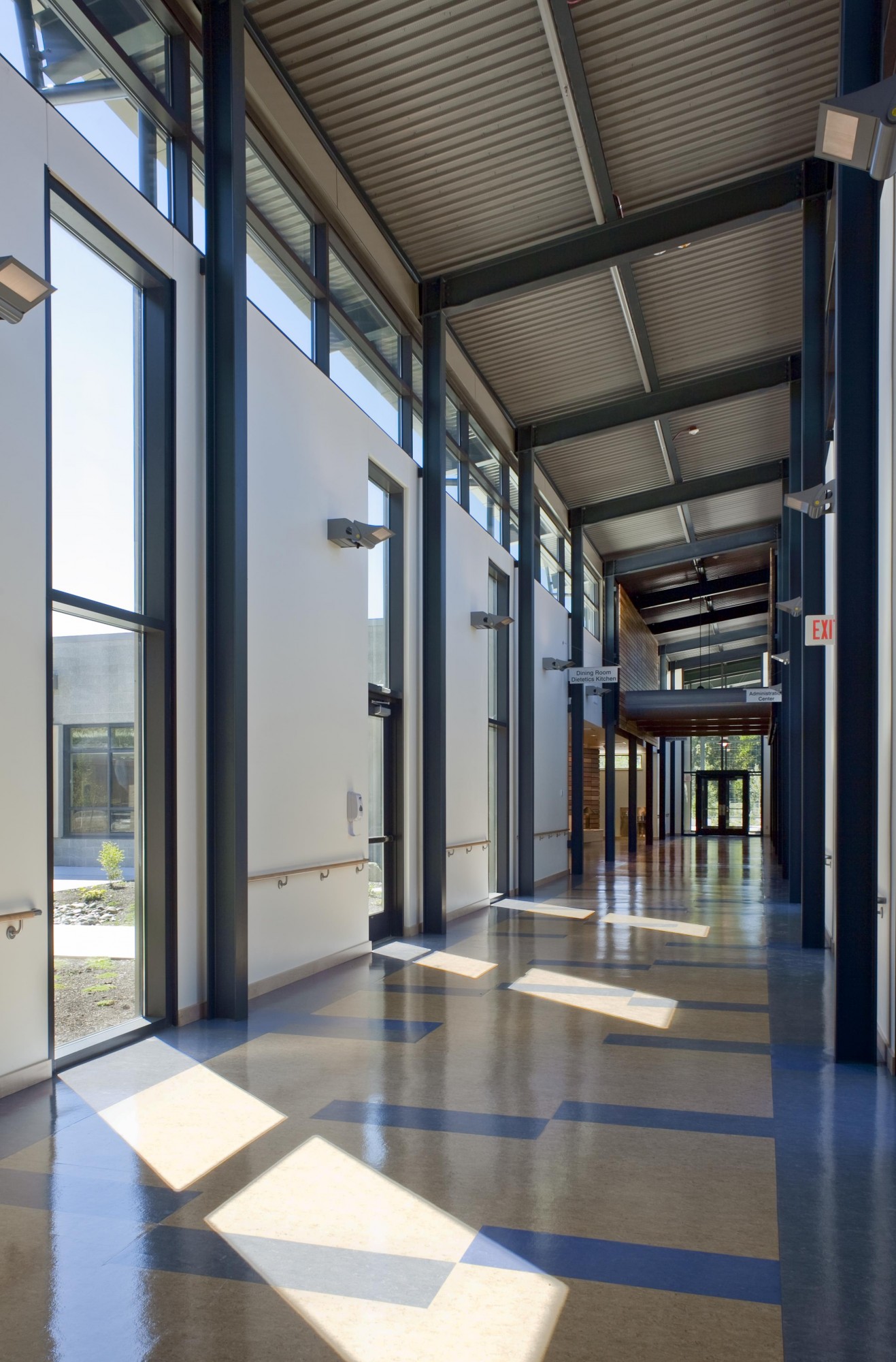 In response to the VA’s requirement for a single story facility, the design solution merges the building with its site. The dietetics kitchen is submerged into the earth on the public side of the building, while the resident rooms, covered with an extensive green roof system, are configured to maximize views. A gently curving corridor provides generous daylight while avoiding the monotony of a long, straight hallway. Successful design solutions improving daylighting, patient access to amenities, efficiency, and overall aesthetic of the environment have bolstered the morale of staff and patients alike within this contemporary facility.