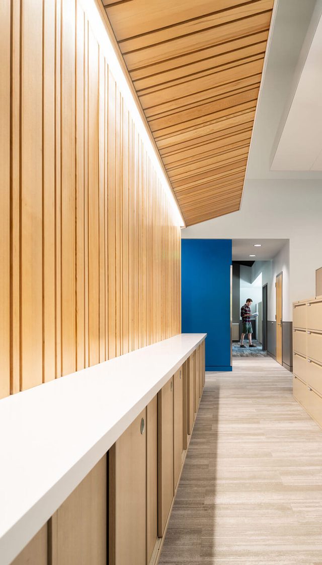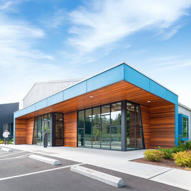 Phase One delivers a renewed and expanded facility that brings administrative, operations, and customer service functions together under one roof—anchored by a public meeting space that strengthens community connection. The design enhances the existing single-story structure while introducing a complementary addition, unified through a consistent palette of metal roofing, fiber cement siding, and clear-sealed cedar. These materials create a cohesive identity between old and new, marking the entry with a welcoming, dynamic expression that reflects both functionality and craft.