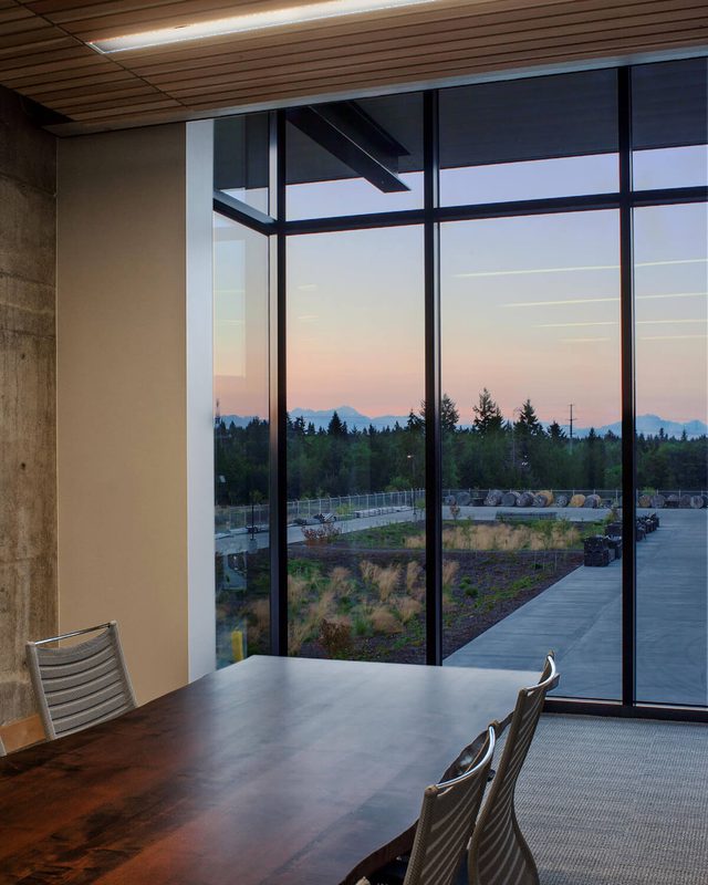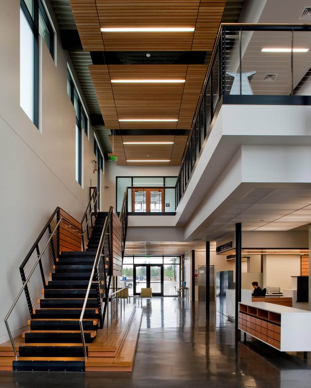 Refined yet distinctly industrial, the architecture reflects the merging of administrative and crew functions. Concrete, steel, masonry, and wood create a durable and timeless expression rooted in the working character of Mason County. The material palette balances strength and warmth, reinforcing the PUD’s role as both essential service provider and community partner.