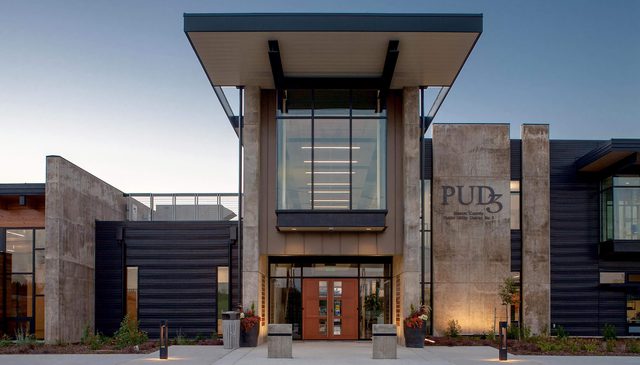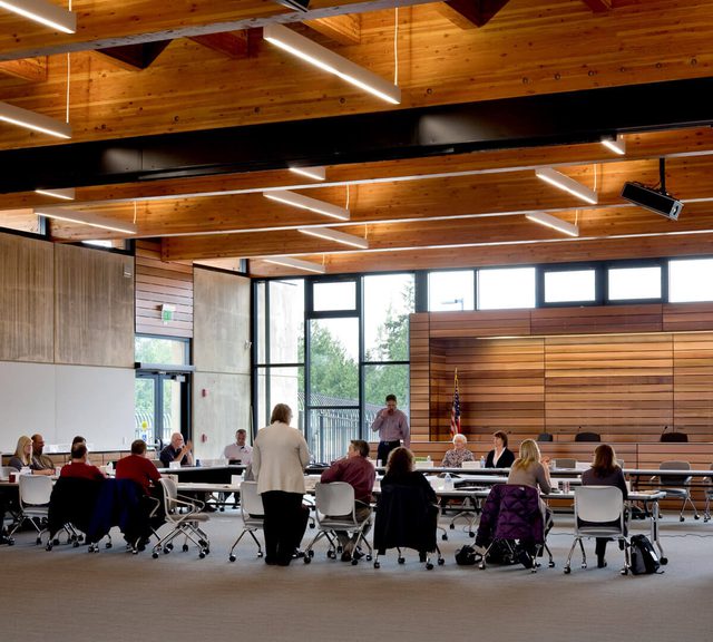 The west end of the Administration Building includes a large auditorium used for PUD Commission meetings and available for public gatherings. Constructed with locally sourced wood species such as Douglas fir and cedar, the space honors the region’s timber heritage while contributing to the local economy.
